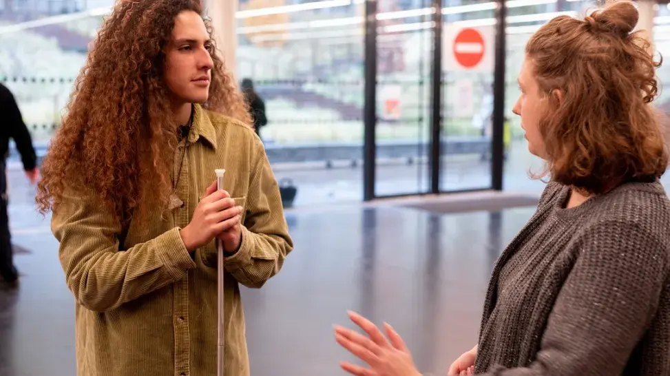 Farah, étudiante en L2 de droit : « J’ai été guide pendant quelques minutes. L’étudiant que j’ai guidé a eu beaucoup de difficultés. Avant cette expérience, je ne me rendais pas vraiment compte des problèmes de mobilité qu’une personne non-voyante pouvait rencontrer au quotidien. Guider quelqu’un n’est pas facile. »